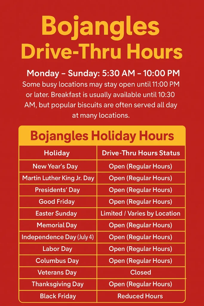 👉 Since hours can vary by location, it’s always a good idea to check your nearest Bojangles restaurant through Google Maps or their official website before visiting.